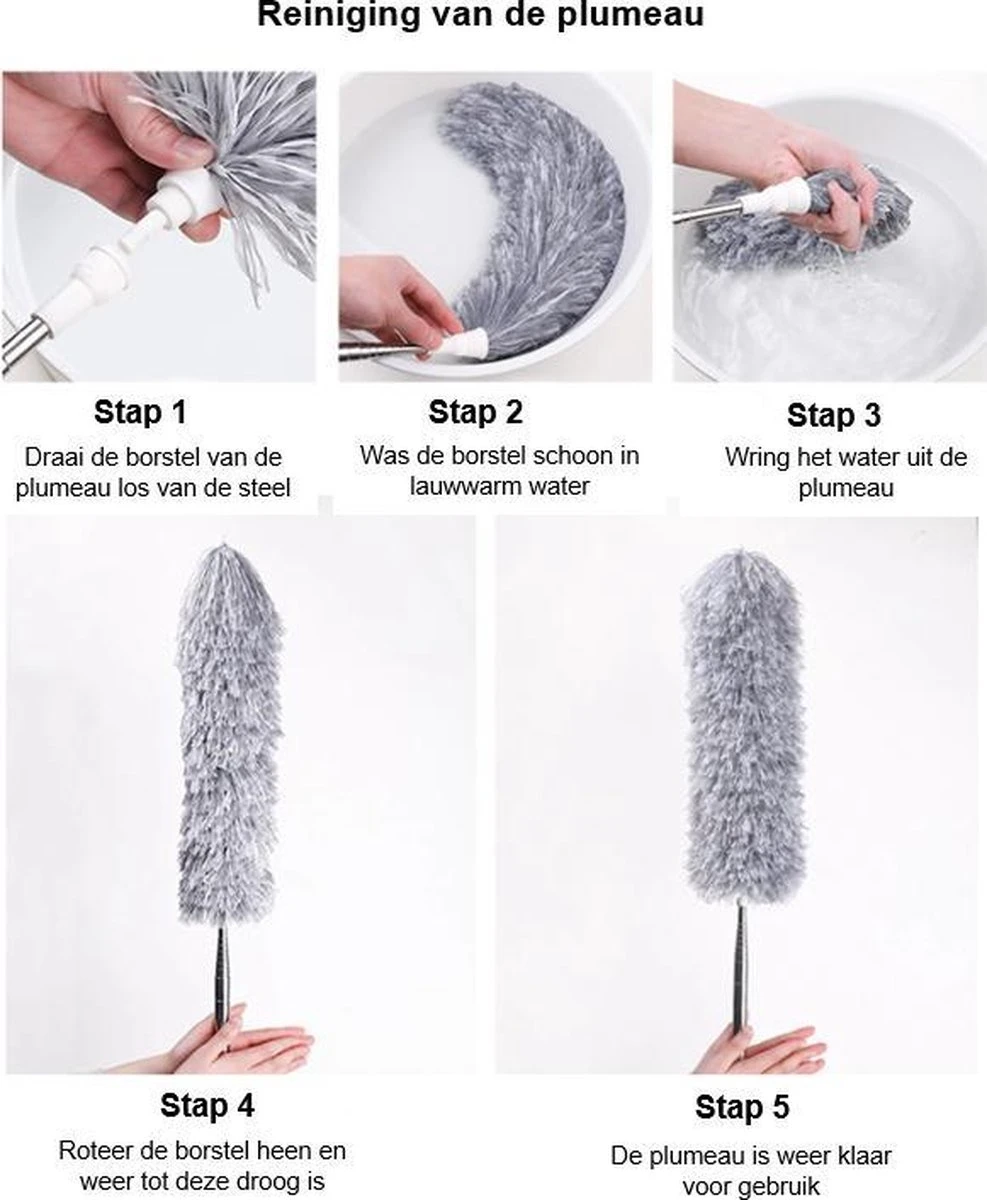 Na gebruik kun je de plumeau schoonmaken. Draai hiervoor de borstel los van de steel en was de borstel schoon. Hierna wring je de borstel uit en roteer je deze tot het droog is. De plumeau is weer klaar voor gebruik.