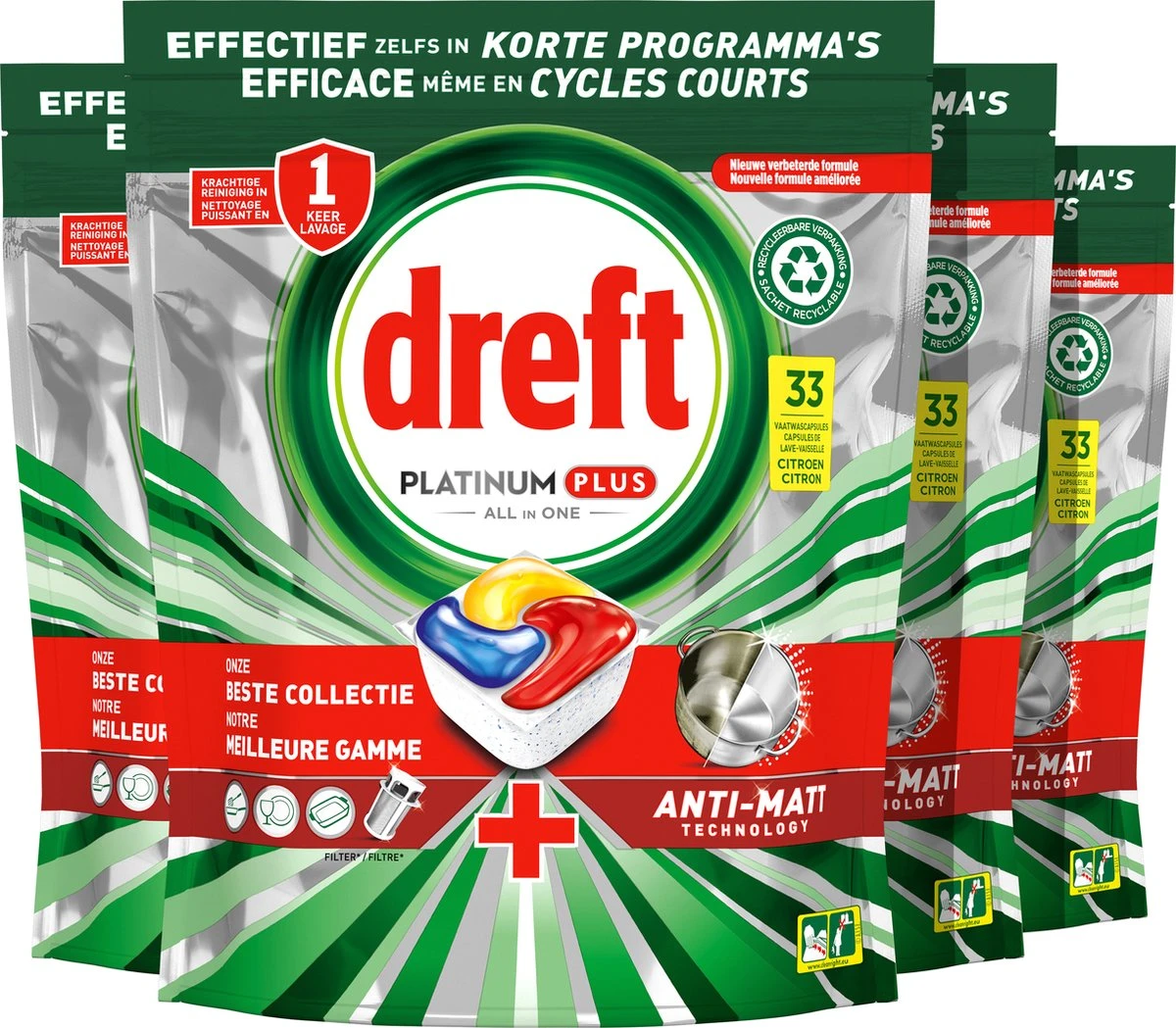 Dreft Platinum Plus All in One vaatwascapsules zorgen voor een reiniging als nieuw, het geeft je Dreft’s beste collectie voor het reinigen van hardnekkig voedsel en het helpt zelfs de dofheid weg te nemen die in de loop van de tijd is opgebouwd, om de oorspronkelijke glans van je vaatwerk te herstellen. Dreft Platinum Plus geeft je een uitmuntende reiniging en verwijdert hardnekkige voedselvlekken, zelfs in de testconditie van een korte cyclus. Dus, als je weinig tijd hebt, is er niets aan de hand. Schakel over op kort. Dreft combineert vloeistof en poeder in één krachtige capsule. Het ultra-oplosbare zakje lost snel op en werkt goed in korte cycli omdat het snel begint te reinigen om de klus klaar te krijgen. En ze zijn gemakkelijk te gebruiken. Plaats ze gewoon in het doseerbakje van je vaatwasser, met verpakking. Schakel over op de korte cyclus* en bespaar tijd, energie en water in vergelijking met een gewone, standaard cyclus!