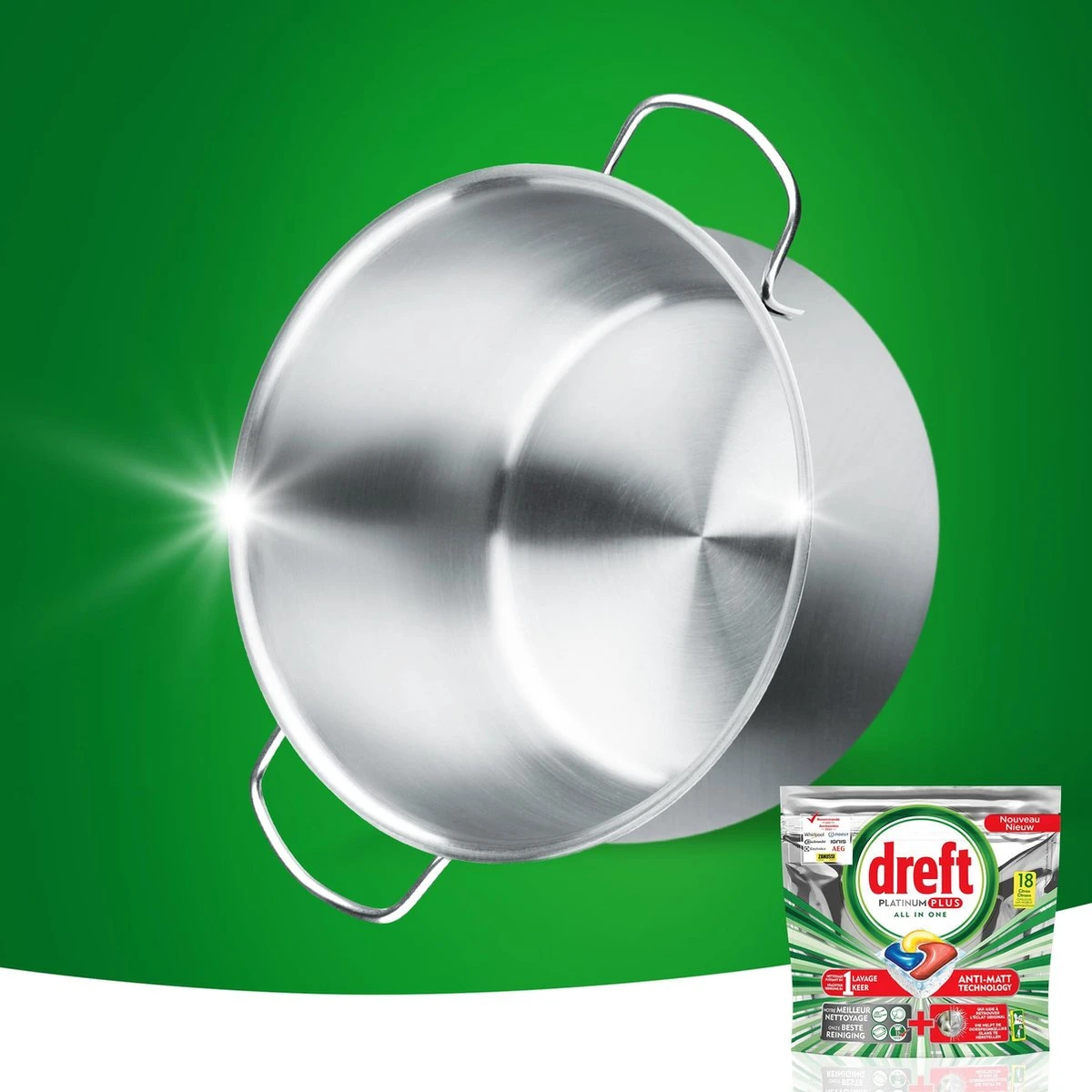 Dankzij Dreft Platinum vaatwastabletten kunt u koken wat u wilt want ze verwijderen zelfs de hardnekkigste etensresten. Dreft Platinum vaatwastabletten breken hardnekkige etensresten zoals pasta, rijst, eieren en vlees af, terwijl de unieke vloeibare bovenzijde van de tablet vet en olie aanpakt en niets anders dan een schone vaat achterlaat. Dreft Platinum helpt zelfs verborgen vetresten uit uw vaatwasser te verwijderen en laat uw vaat, en uw vaatwasser, stralend schoon achter.