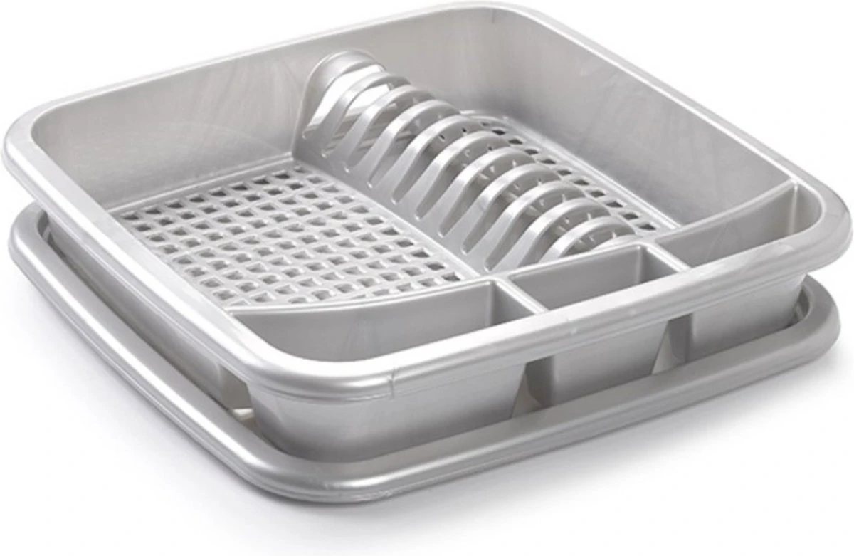 Een lichtgrijs afwasrek/afdruiprek, met lekbak om het water op te vangen zodat niet het hele aanrecht nat wordt. Het rek heeft ruimte voor 12 borden, 3 bestekbakken en naast de borden kunt u nog glazen/bekers kwijt. U kunt het rek van de lekbak halen, om beide afzonderlijk droog te kunnen maken.Afmeting: ca. 39 x 39 x 8 cm. Materiaal: kunststof. Keukenbenodigdheden – Afwassen/afdrogen – Afwasrekken – Afdruiprekken met lekbak.