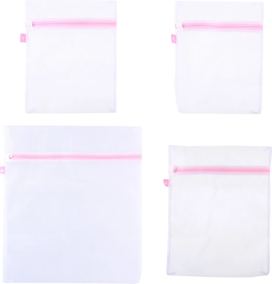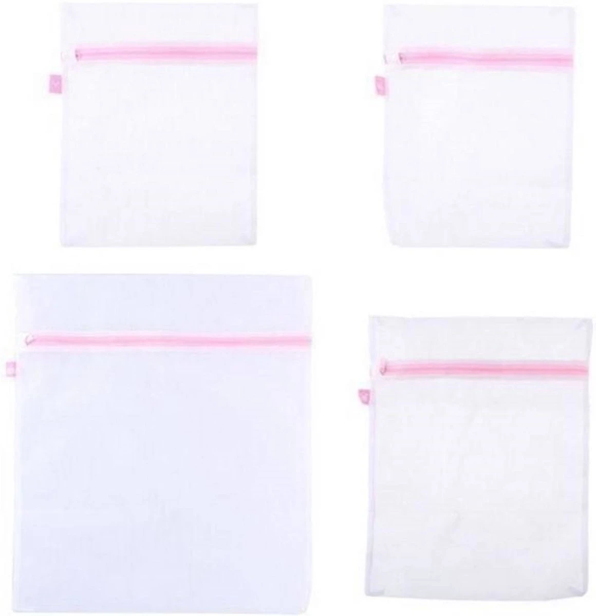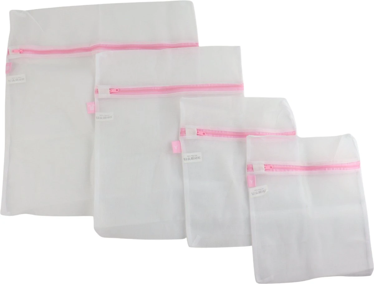 Set van 4x stuks waszakjes/wasnetjes wit/roze in 3 formaten. Deze waszakjes beschermem klein wasgoed, zoals bh’s of panty’s tijdens het wassen en centrifugeren. Voorzien van een rits sluiting. Afmetingen: ca. 46 x 50 cm, 34 x 43 cm en 26 x 33 cm. Materiaal: polyester.