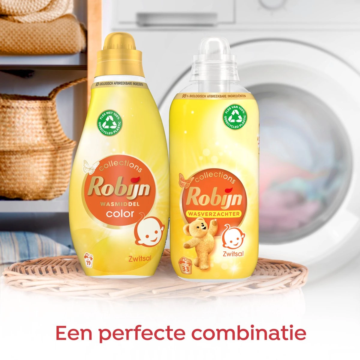 Robijn Klein & Krachtig Collections Color Zwitsal Vloeibaar Wasmiddel, met milde Zwitsal geur, heeft een unieke formule die speciaal is ontwikkeld voor de gekleurde en bonte was tot op 40 graden. Het wasmiddel zorgt ervoor dat je favoriete gekleurde en bonte kleding lang mooi blijft. Zo kun jij goed voor de dag komen. De verbeterde formule van Robijn Zwitsal bevat 80% biologisch afbreekbare ingrediënten. We zijn op weg naar volledig biologisch afbreekbare formules. De vertrouwde effectiviteit en bekende geuren van Robijn, gecombineerd met de kracht van de natuur. Goed voor je kleding en beter voor de planeet. Bovendien zijn de flessen gemaakt van 100% gerecycled en 100% recyclebaar plastic. Op deze manier draagt Robijn bij aan een duurzamere manier van wassen.